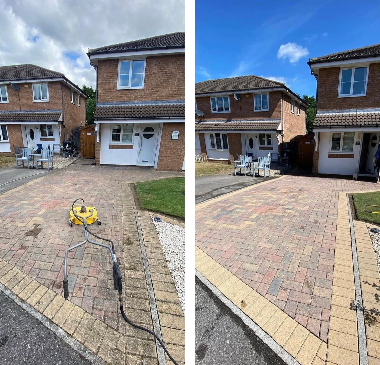 Driveway and patio cleaning byHJC Cleaning and Property Maintenance– we use high-pressure washing to remove dirt, moss, and grime, then re-sand and seal where needed to restore a clean, slip-resistant finish. Transforming your outdoor surfaces with care!