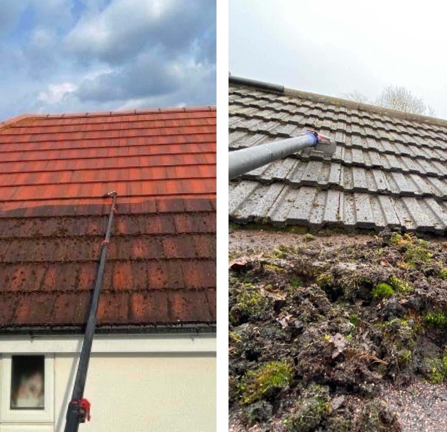 Roof cleaning and moss removal by HJC Cleaning and Property Maintenance – we carefully remove moss by hand or low-pressure scraping, then treat the roof with a biocide solution to kill remaining spores and prevent regrowth. A clean roof that looks great and lasts longer!
